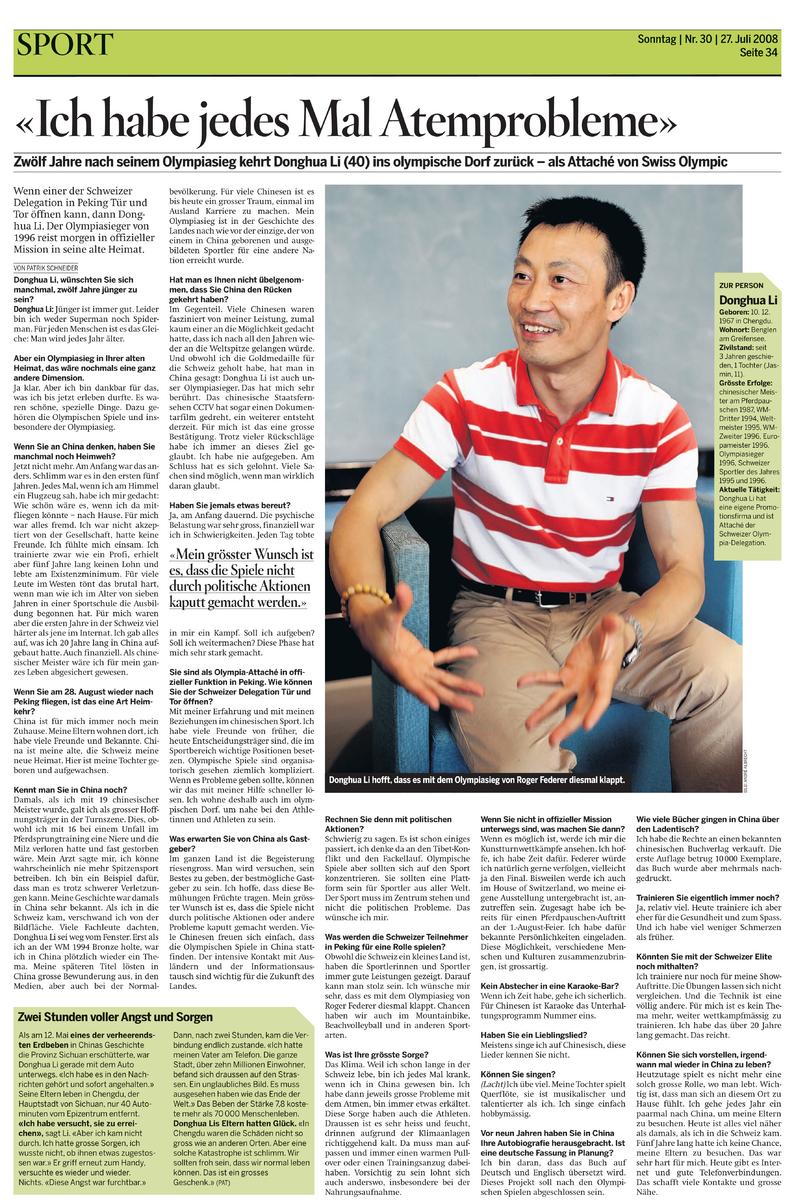 Damals, als ich mit 19 chinesischer Meister wurde, galt ich als grosser Hoffnungsträger in der Turnszene. Dies, obwohl ich mit 16 bei einem Unfall im Pferdsprungtraining eine Niere und die Milz verloren hatte und fast gestorben wäre. Mein Arzt sagte mir, ich könne wahrscheinlich nie mehr Spitzensport betreiben. Ich bin ein Beispiel dafür, dass man es trotz schwerer Verletzungen kann. Meine Geschichte war damals in China sehr bekannt. Als ich in die Schweiz kam, verschwand ich von der Bildfläche. Viele Fachleute dachten, Donghua Li sei weg vom Fenster. Erst als ich an der WM 1994 Bronze holte, war ich in China plötzlich wieder ein Thema. Meine späteren Titel lösten in China grosse Bewunderung aus, in den Medien, aber auch bei der Normalbevölkerung. Für viele Chinesen ist es bis heute ein grosser Traum, einmal im Ausland Karriere zu machen. Mein Olympiasieg ist in der Geschichte des Landes nach wie vor der einzige, der von einem in China geborenen und ausgebildeten Sportler für eine andere Nation erreicht wurde.